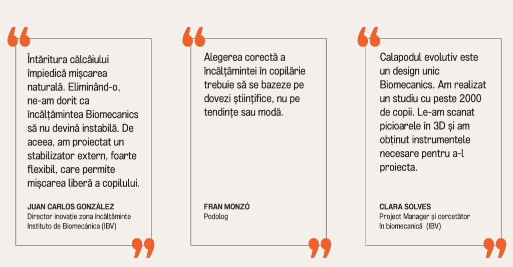 Pentru noi, știința și Institutul de Biomecanică (IBV) ne oferă cheile pentru a proiecta încălțăminte adecvată și respectuoasă pentru picioarele lor; deoarece picioarele au nevoie de libertate și respect, da — dar și de calitate, potrivire, protecție, confort și durabilitate. Iar pentru noi, a reuni toate acestea în încălțămintea noastră, astfel încât cei mici să poată crește cu ea, este cel mai natural lucru.